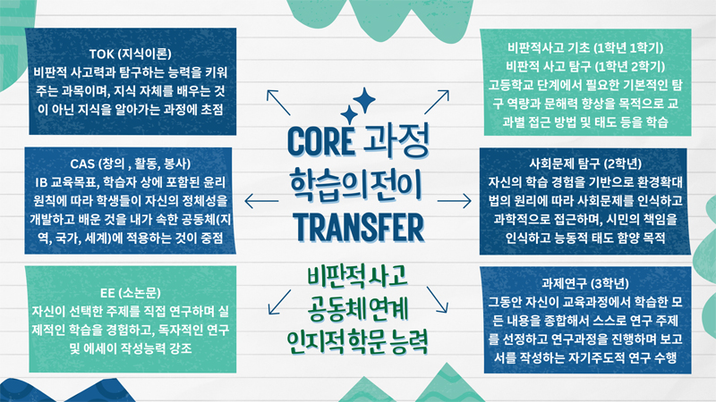 | CAS(Creativity, Activity, Service) | 창의, 활동, 봉사 | IB의 교육목표 및 IB 학습자상에 포함된 윤리 원칙에 따라 학생들이 자신의 정체성을 개발하고, 배운 것을 내가 속한 공동체(지역, 국가, 세계)에 적용하는 것이 중점 | 공동체 연계 |